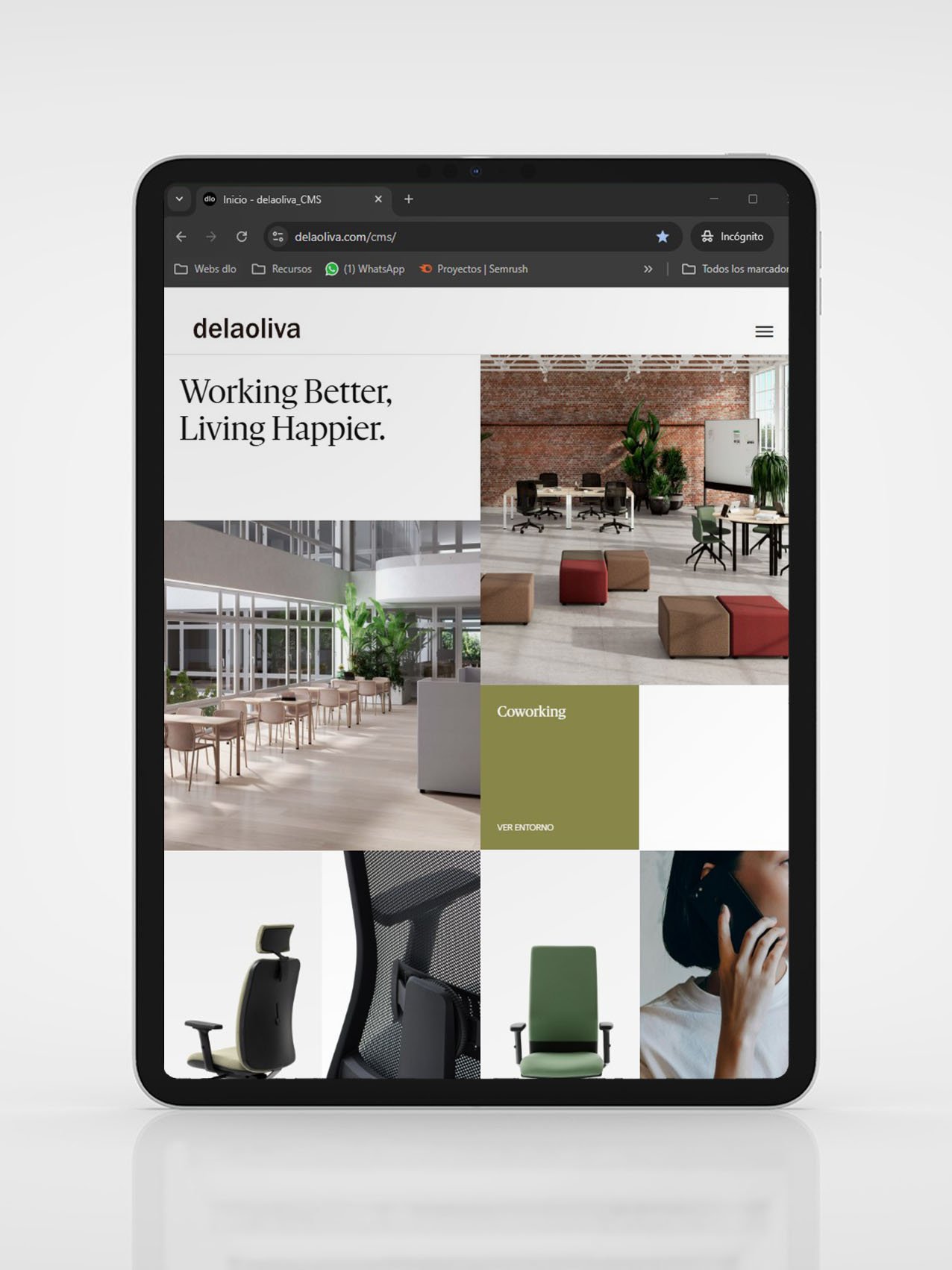 delaoliva es una marca española de mobiliario de oficina con más de 60 años de trayectoria. El reto: evolucionar su presencia digital con una web que refleje su identidad, facilite la consulta de productos y genere oportunidades comerciales desde mercados nacionales e internacionales.