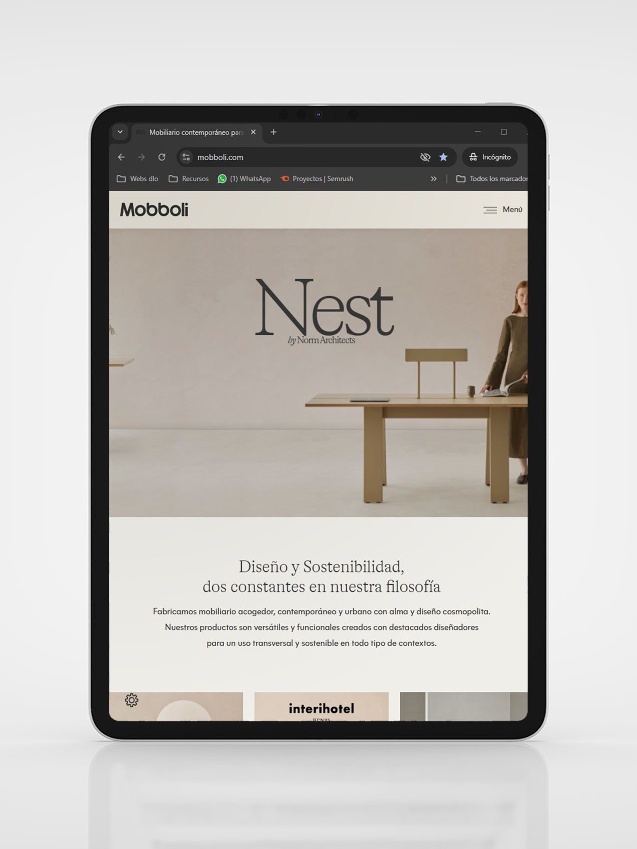 Mobboli es una firma de mobiliario contemporáneo con fuerte foco en color, tapicerías y sostenibilidad. El objetivo: evolucionar su web hacia una experiencia editorial de marca que potencie colecciones, acabados y proyectos contract, conectando con prescriptores (arquitectura/interiorismo) y distribuidores.
