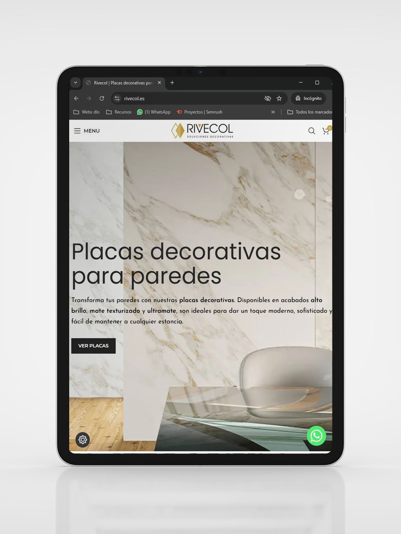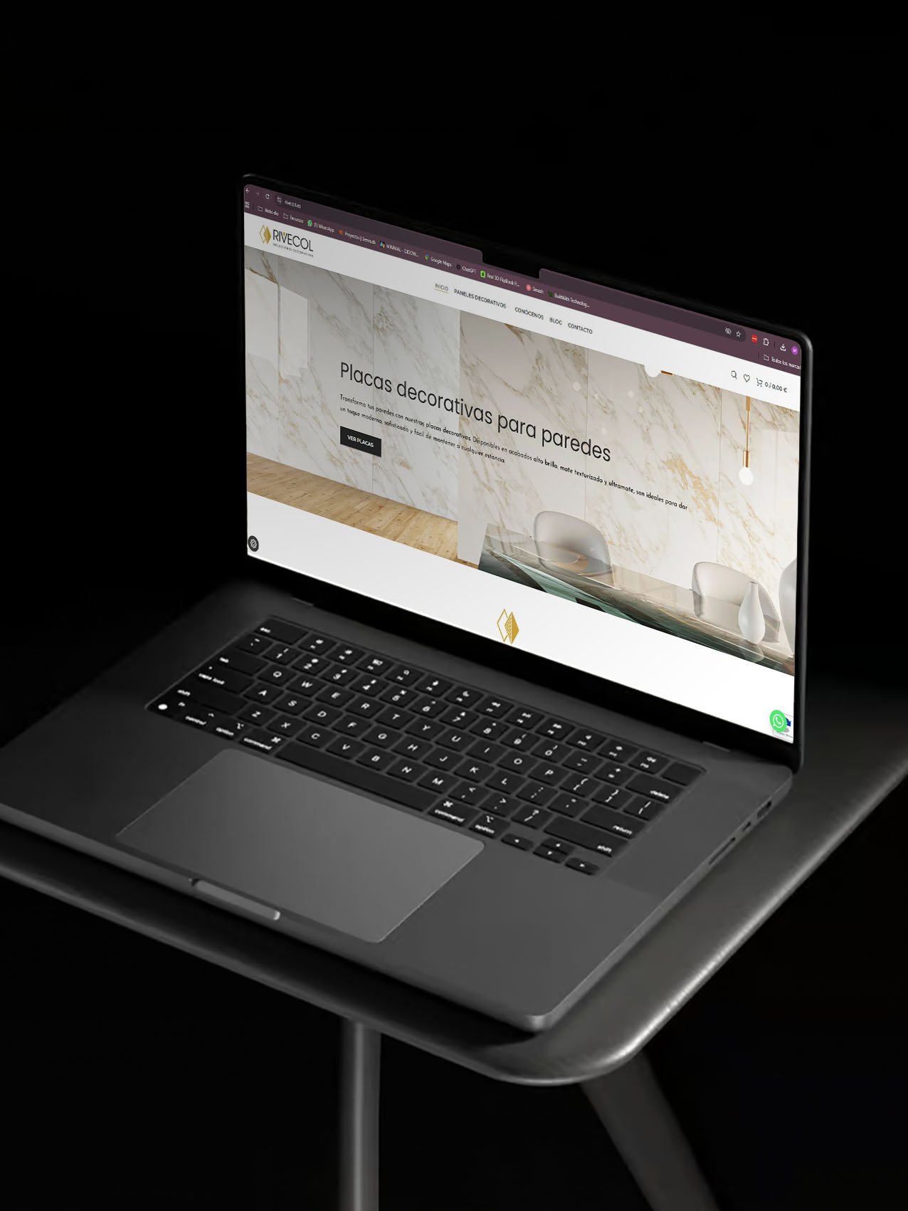 Rivecol vende placas decorativas para pared listas para instalar sin obras y con envío a toda la península. El reto era crear una web que hiciera tres cosas a la vez: inspirar, explicar y vender… en móvil.